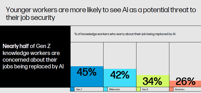 While there is appetite for the use of AI, employees harbor concerns about its potential impact on their job security. Younger workers are more likely to see AI as a potential threat to their job security. Nearly half of Gen Z knowledge workers are concerned about their jobs being replaced by AI.