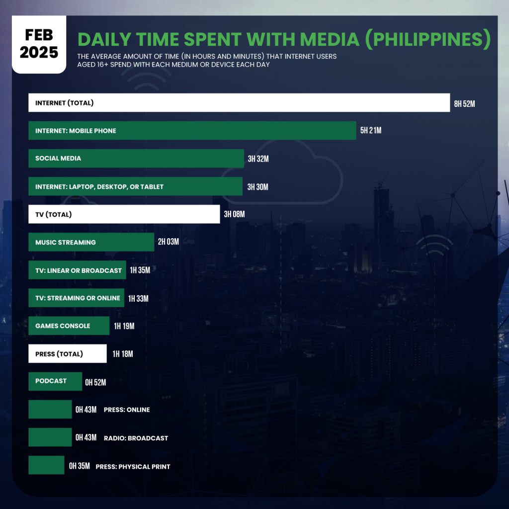 Filipinos, on average, spend eight hours and 52 minutes daily on the internet, latest insights showed. The figure is significantly higher than the global average of six hours and 38 minutes. The report said that most of this time on the internet is spent on mobile phones at five hours and 21 minutes. This figure is also ahead of the global average of three hours and 46 minutes. At the time of the report production, data indicated that there were 97.5 million internet users in the Philippines in January 2025.